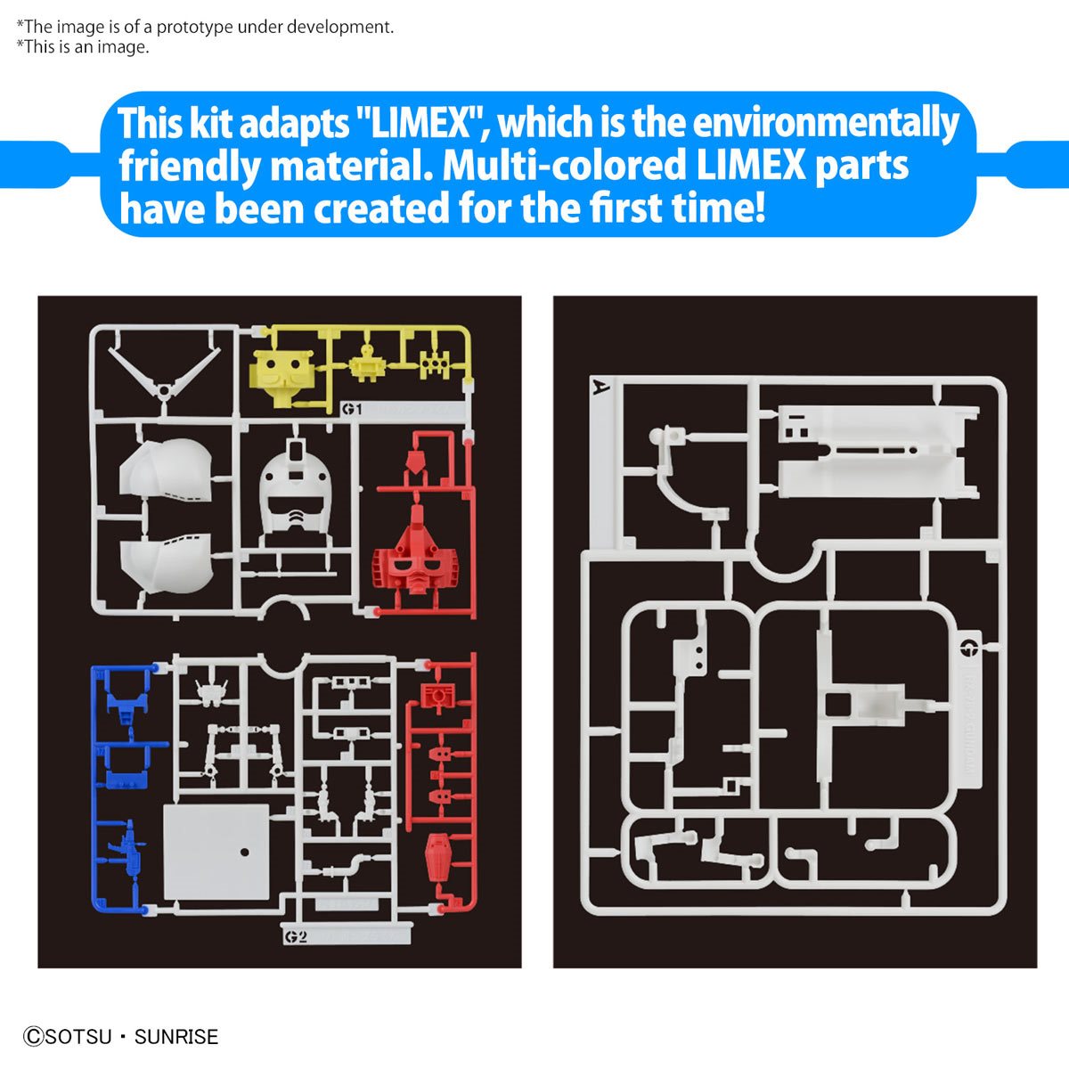 Gunpla-kun is here in color! Gunpla-kun is made of LIMEX -- a new material that combines environmental consideration with the fun of plastic model kits! LIMEX ia a new eco-friendly material that contains more than 50 percent limestone as the main raw material, greatly reducing the use of conventional petroleum-derived plastics. This is the first time in history that LIMEX has been molded in full color! You can build Gunpla-kun into a full figure as shown here, or you can assemble him partially with some of the parts still on the runners and display him that way! He comes with his familiar armaments, such as the beam rifle, beam saber and shield.
