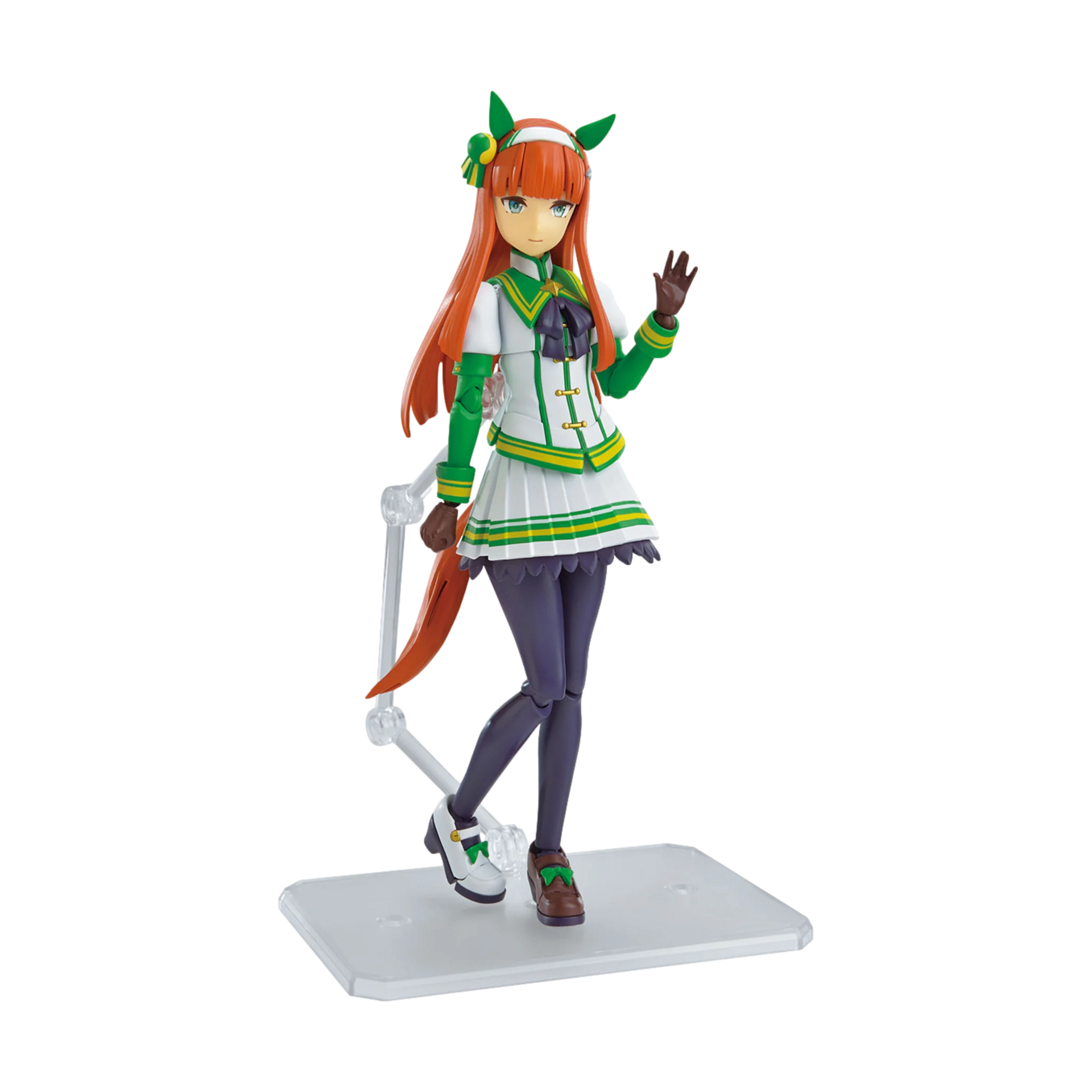 Silence Suzuka from "Uma Musume Pretty Derby" joins the "Figure-rise Standard" model-kit team from Bandai! She'll be fully posable for all kinds of adventures when completed; her skirt can be divided into front and back parts for a wide range of motion. Her skirt can also be spread, as if she's in forward motion, so her sleek silhouette can be maintained when she's at speed. Three different interchangeable faces are included, with the smiling face being tampo-printed and the other two faces using waterslide decals. The kit is molded in color, so her complex outfit can be easily recreated just by assembling it; her ears, hair, headband and accessories are all reproduced in detail. Her upper body can be tilted for a dynamic running pose, and her tail is highly posable too. The horseshoes on the soles of her shoes are reproduced with stickers, and the shoes are jointed for active running poses! Four sets of expressive interchangeable hands are included, and a clear molded base is included too.